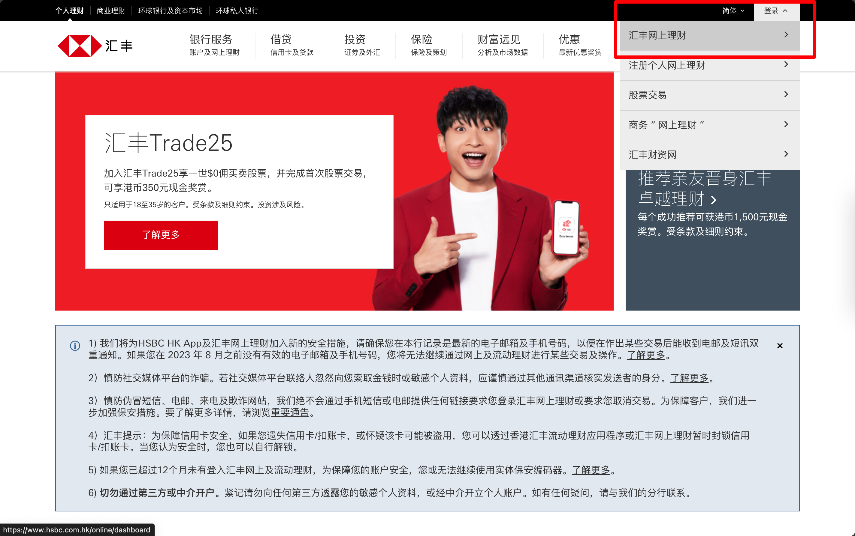 第一步:登录到 HSBC HK 的官网的个人账户中