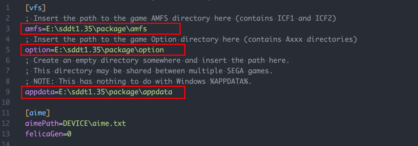 此处需要额外说明的是,如果没有物理读卡器,但是在过去的实体街机游玩时是持有 Aime 卡片,或是在先前的线上服务器版本中使用了 Aime 卡片的,可以在 segatools.ini 文件的同目录下的 DEVICE 目录下的 aime.txt 中直接填写自己持有的或是使用过的卡号。