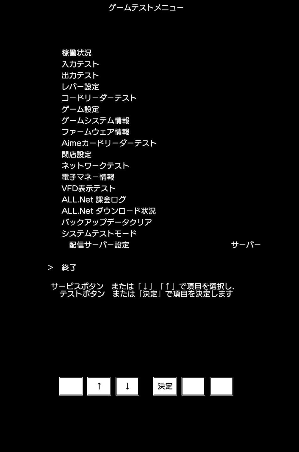 进入 service 模式后,我们可以使用 dinput 部分配置的 LEFT_B 按键(默认是 S)和 LEFT_C 按键(默认是 D)来完成上下导航,使用 RIGHT_A 按键(默认是 J)来确认并进入下级菜单。 在我们完成配置时导航到「终了」并按下 RIGHT_A 按键(默认是 J)来返回到游戏进入前的最后自检模式。