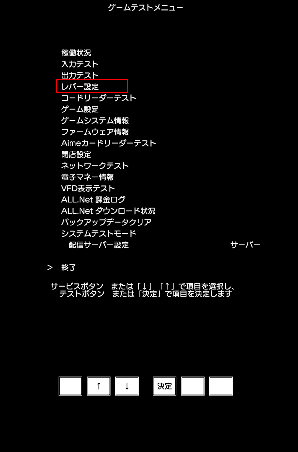 1. 前往 service 模式,导航到「レバー設定(摇杆设定)」并按下 RIGHT_A 按键(默认是 J)来进行摇杆设定