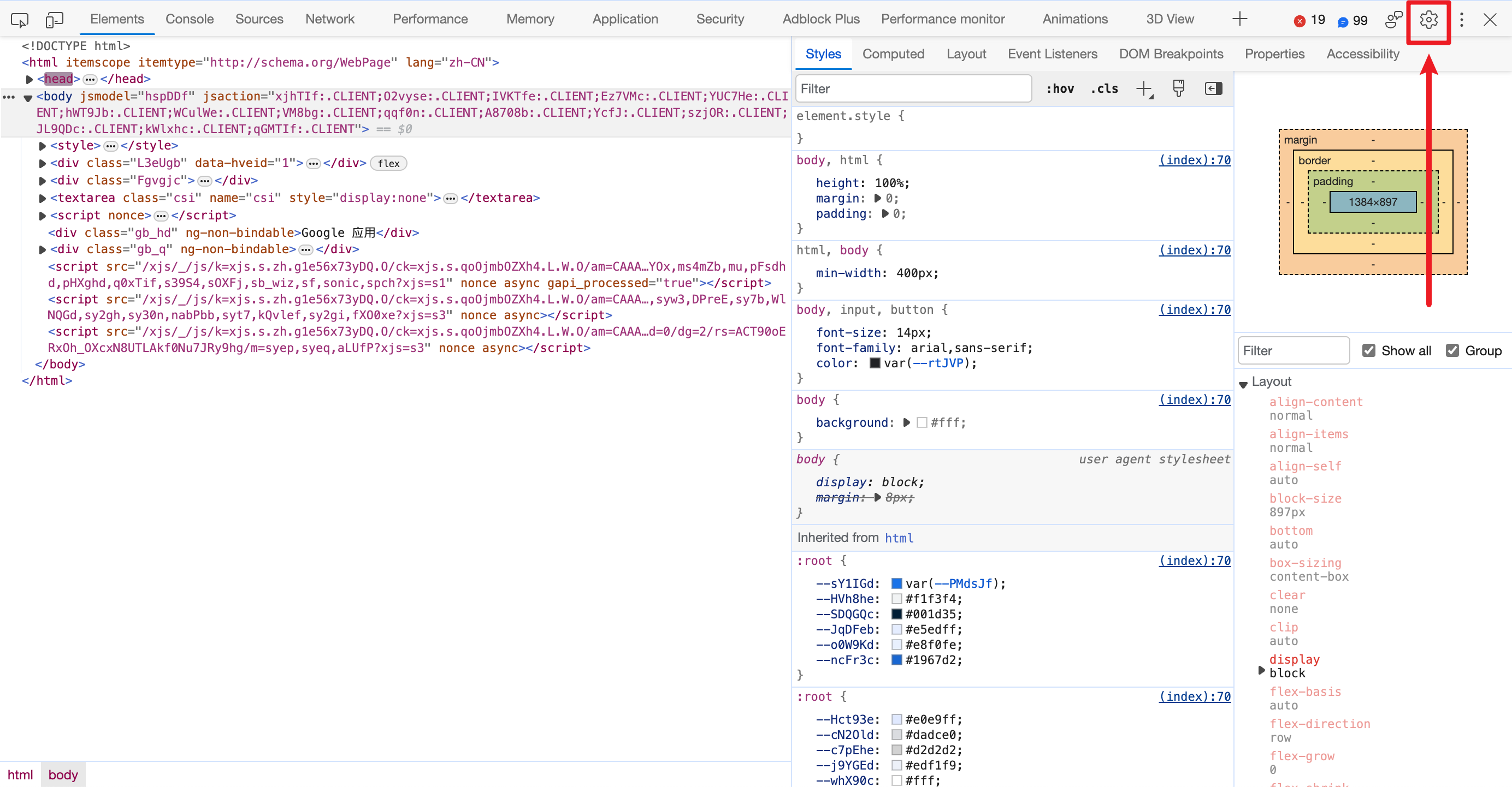 然后找到右上角的设置按钮,点击进入开发者工具的设置: