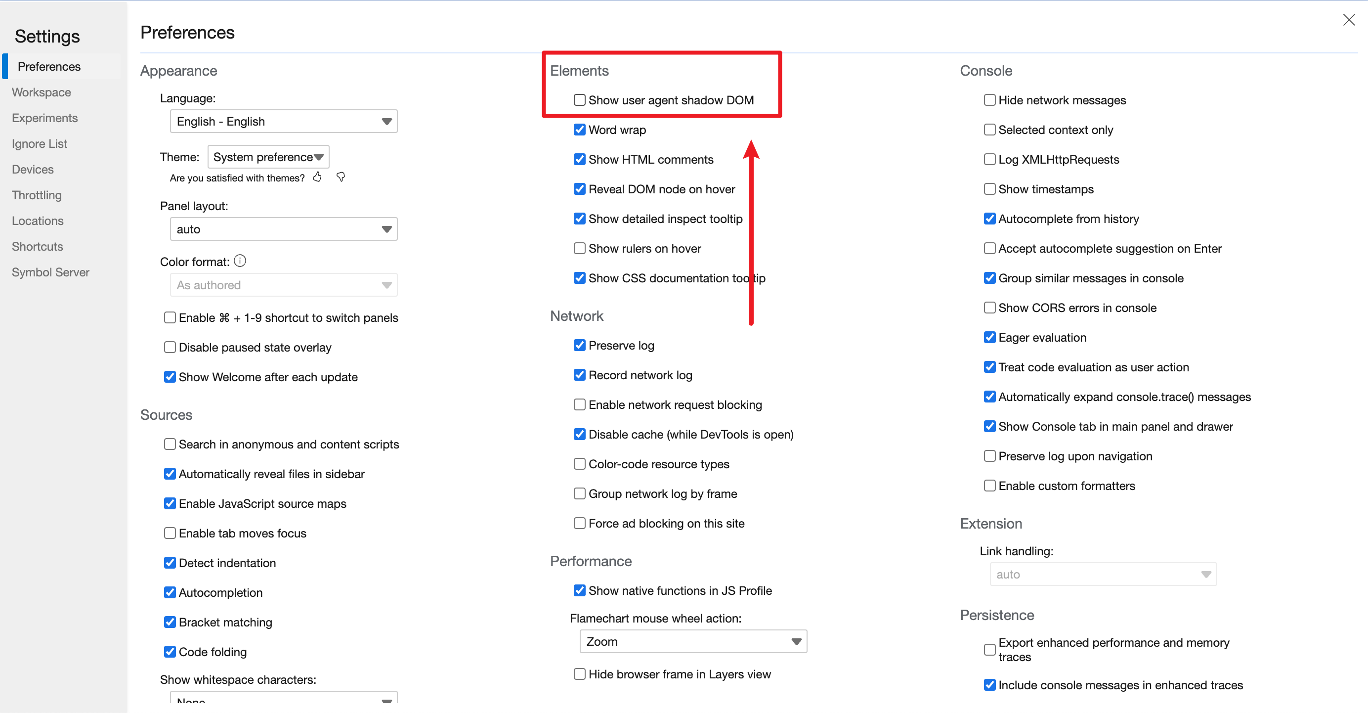 在「元素(Elements)」一列,找到「显示用户代理阴影 DOM(Show user agent shadow DOM)」,勾选即可完成配置。