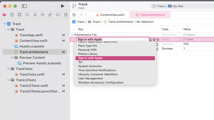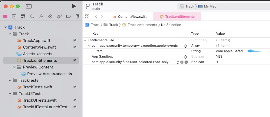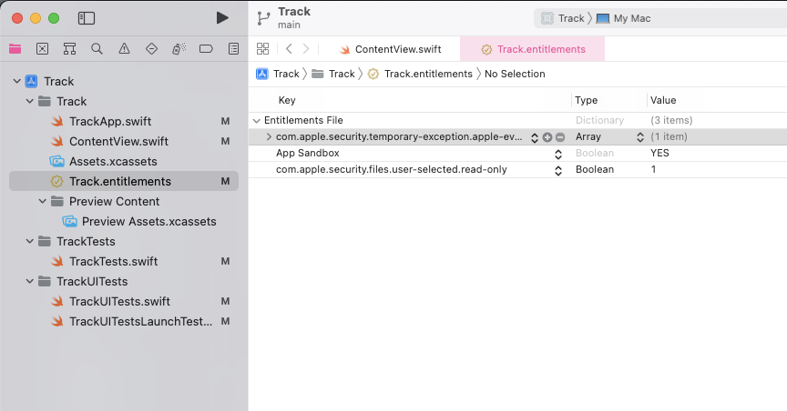 <项目名称>.entitlements 文件中添加字段 com.apple.security.temporary-exception.apple-events,Type(类型)设定为 Array(数组):