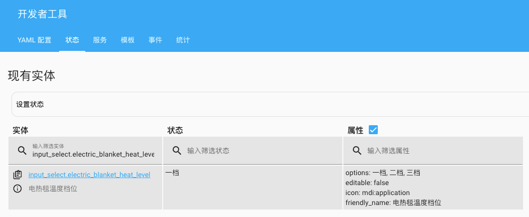 等待重启后我们就能通过右手边侧边栏中选择「开发者工具」-> 点选「状态」Tab -> 在下方「实体」 -> 「输入筛选实体」一栏中输入 input_select.electric_blanket_heat_level 来查看我们刚刚添加的输入选择器。应当能看到如下图一样的界面: