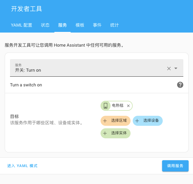 switch.turn_on,在「实体」下拉框中搜索我们想要的实体,此处我们选择switch.hddz_zndrt_d3d8_electric_blanket,然后点击「调用服务」。通过服务直接调用 switch 类型的实体的 turn_on 服务