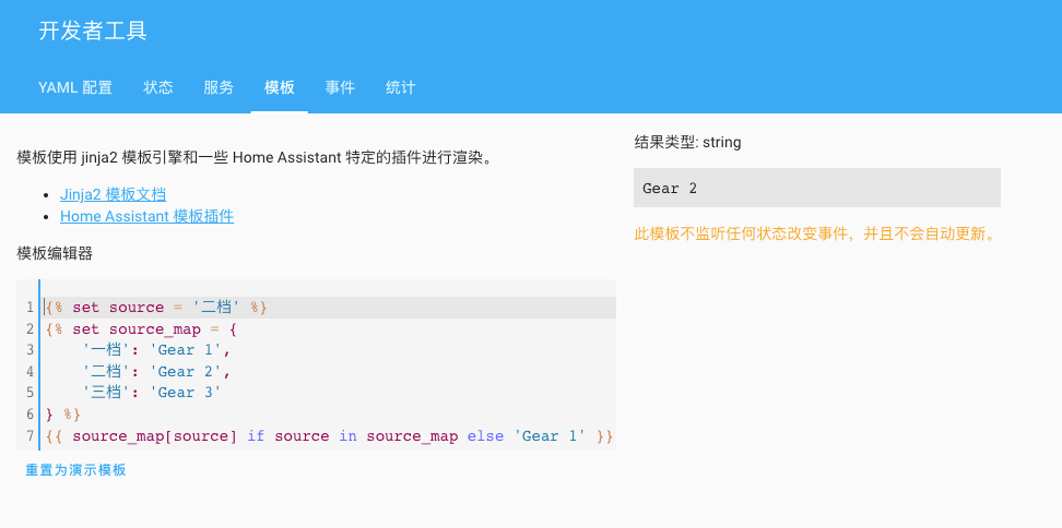 在上图中我们直接将刚刚配置的模板粘贴到了模板编辑器中,可以看到当我们传入 source 为 二档 时,模板的输出为 Gear 2,这就是我们想要的结果。
