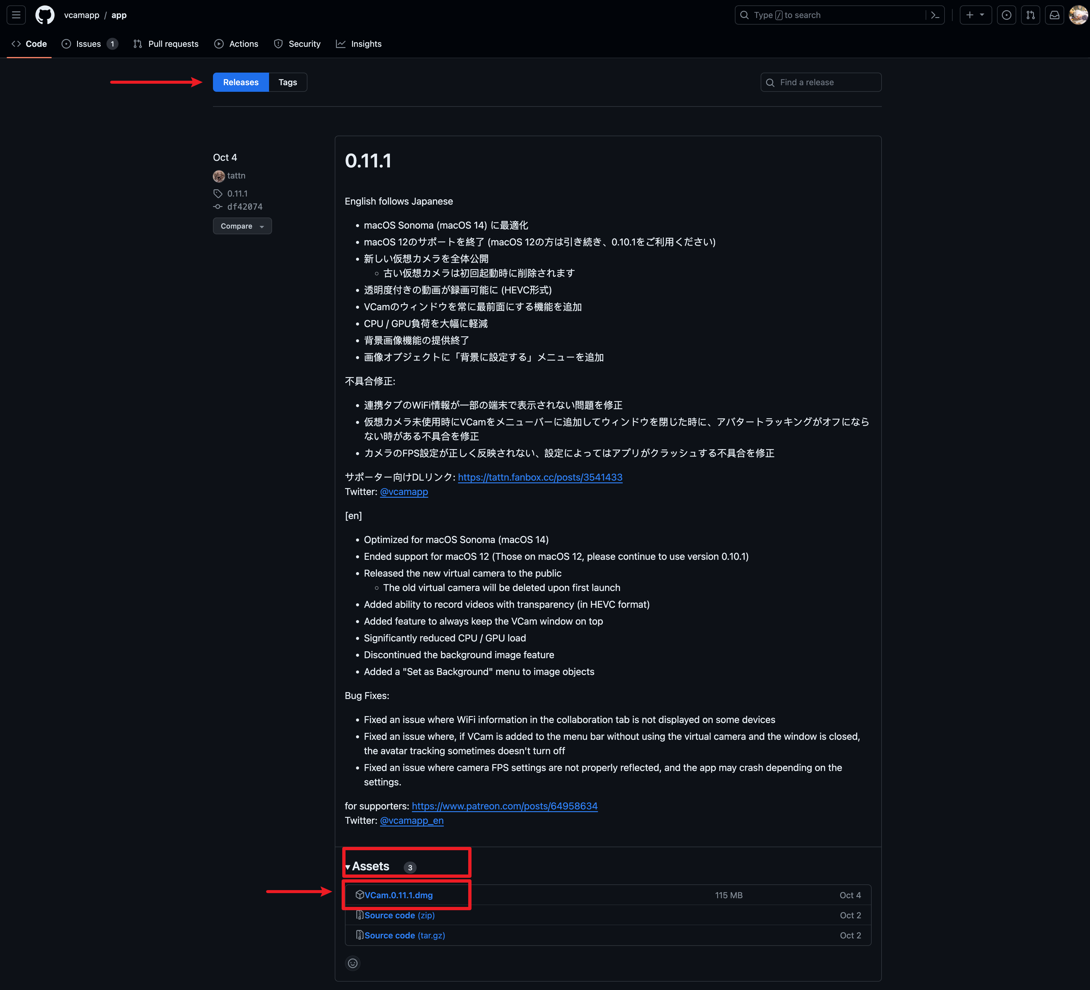 官方建议的下载地点在 VCam 的 GitHub 上的 Release 页面上,所以在 Release 页面中寻找最新版本的 VCam 下载即可: