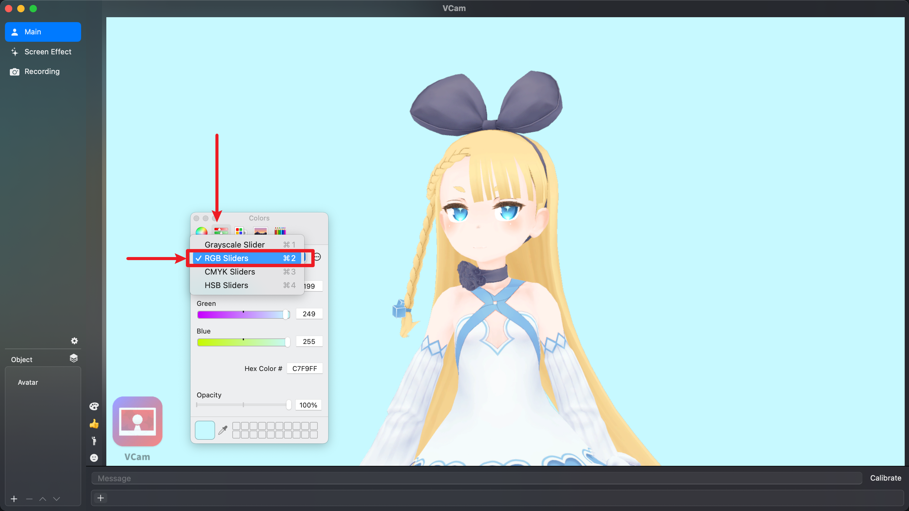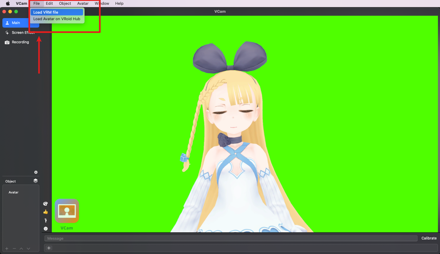 在 VCam 窗口激活的时候,点选菜单栏的「File(文件)」选单,然后点选「Load VRM file(加载 VRM 文件)」并且选择我们先前导出的模型文件就可以加载模型到 VCam 了: