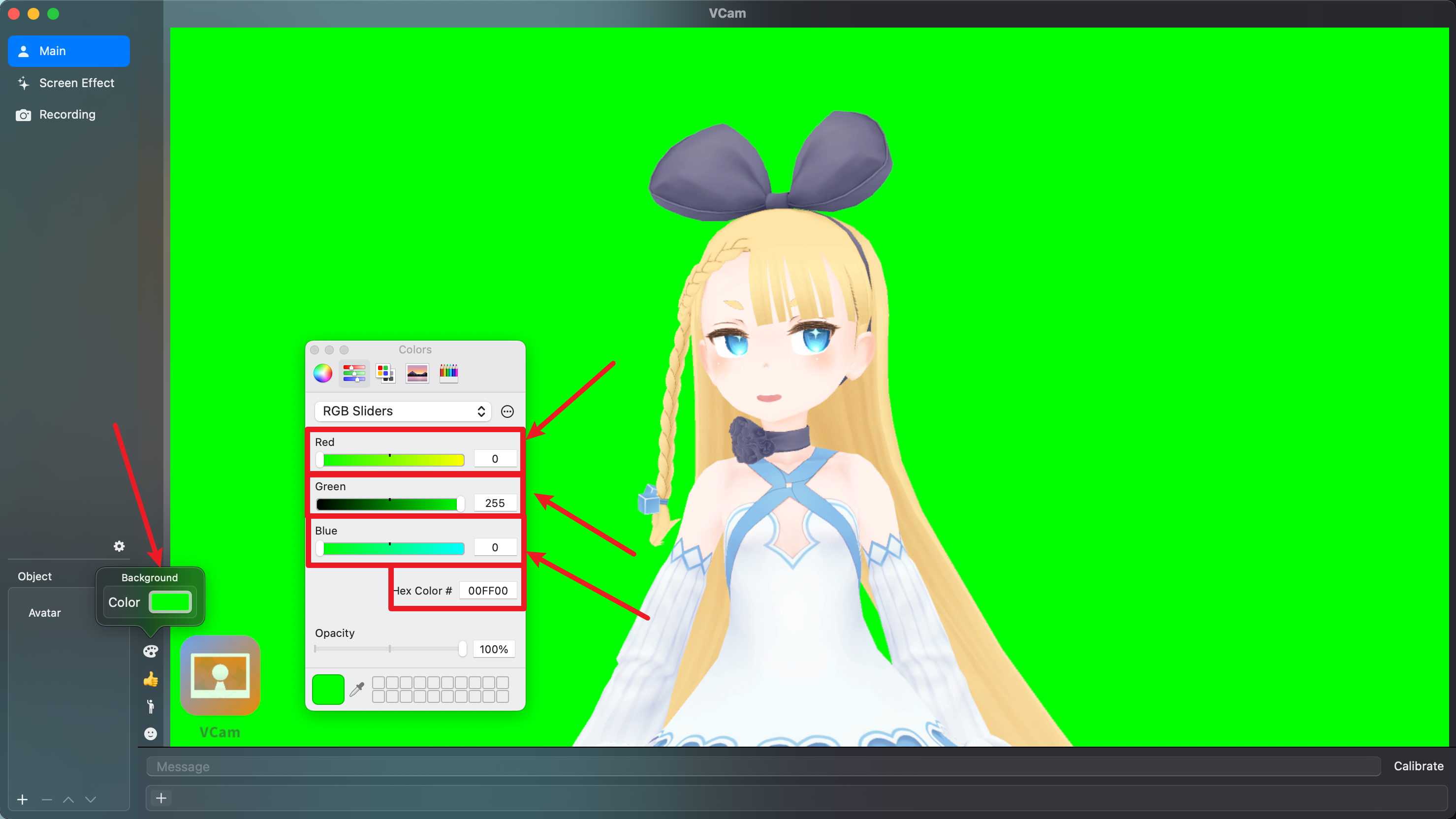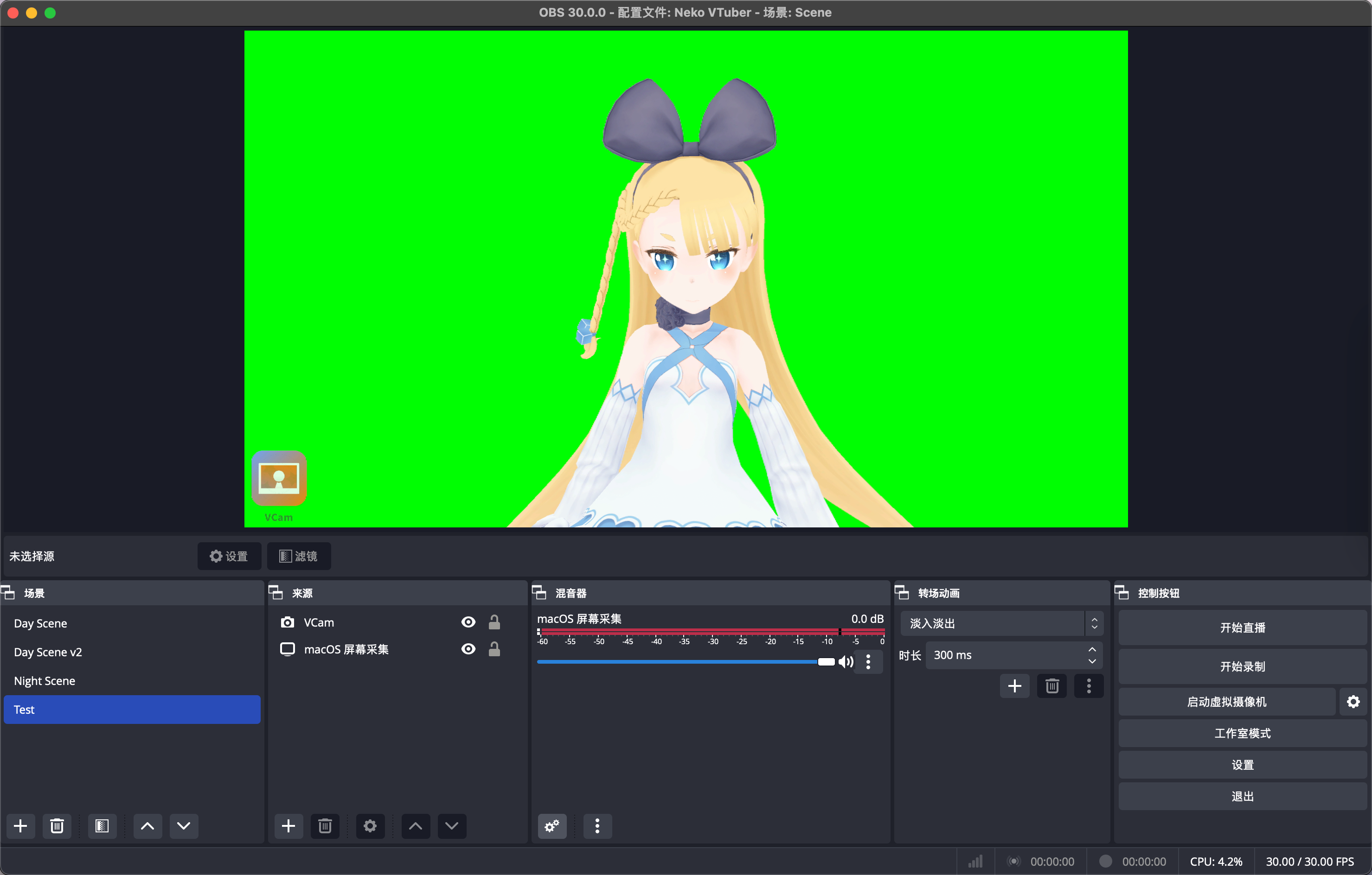 这个时候 VCam 的背景空间应该已经变成纯粹的绿色了,这代表我们已经成功配置好了绿幕,接下来需要配置 OBS 的绿幕裁切。