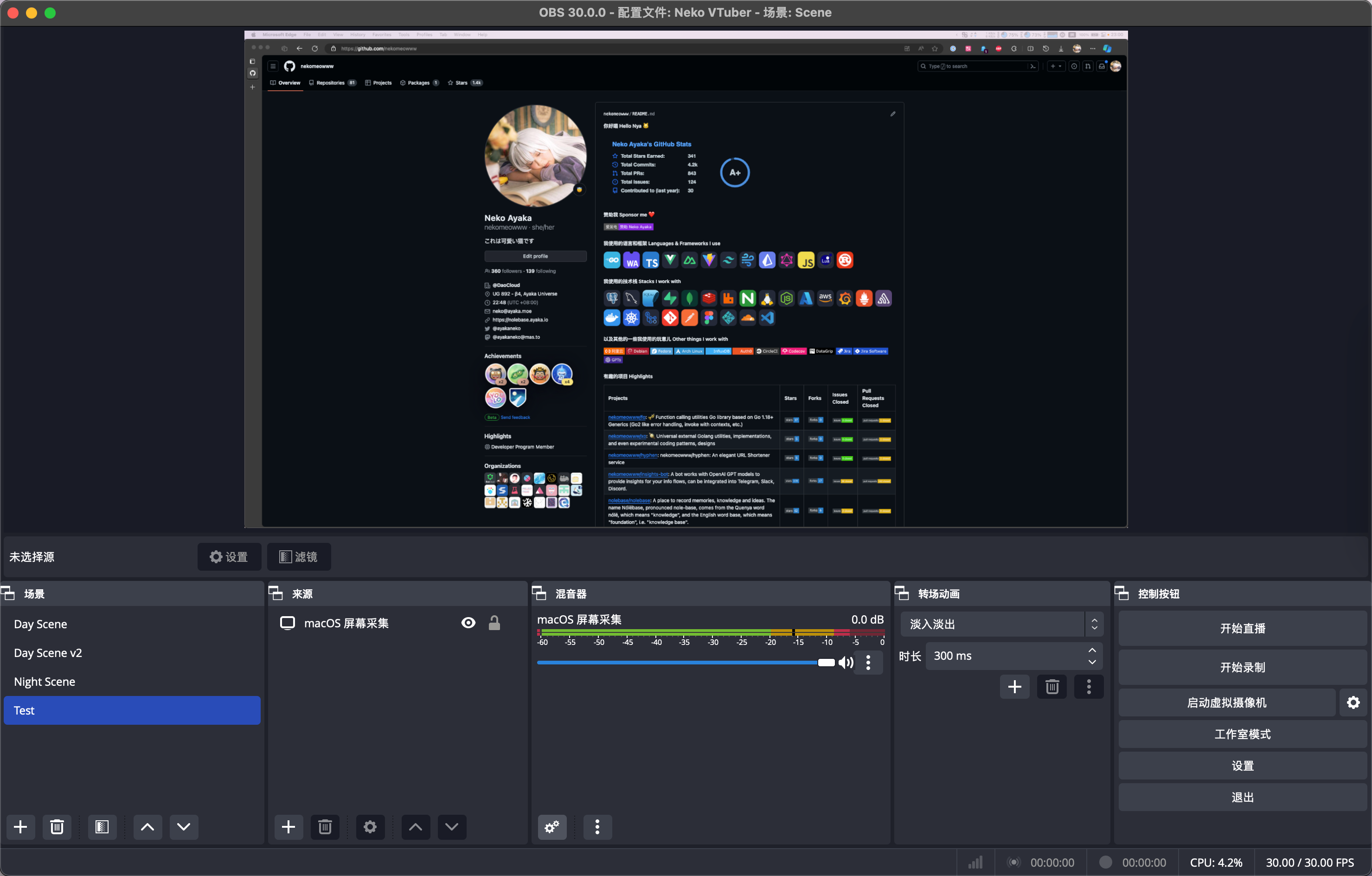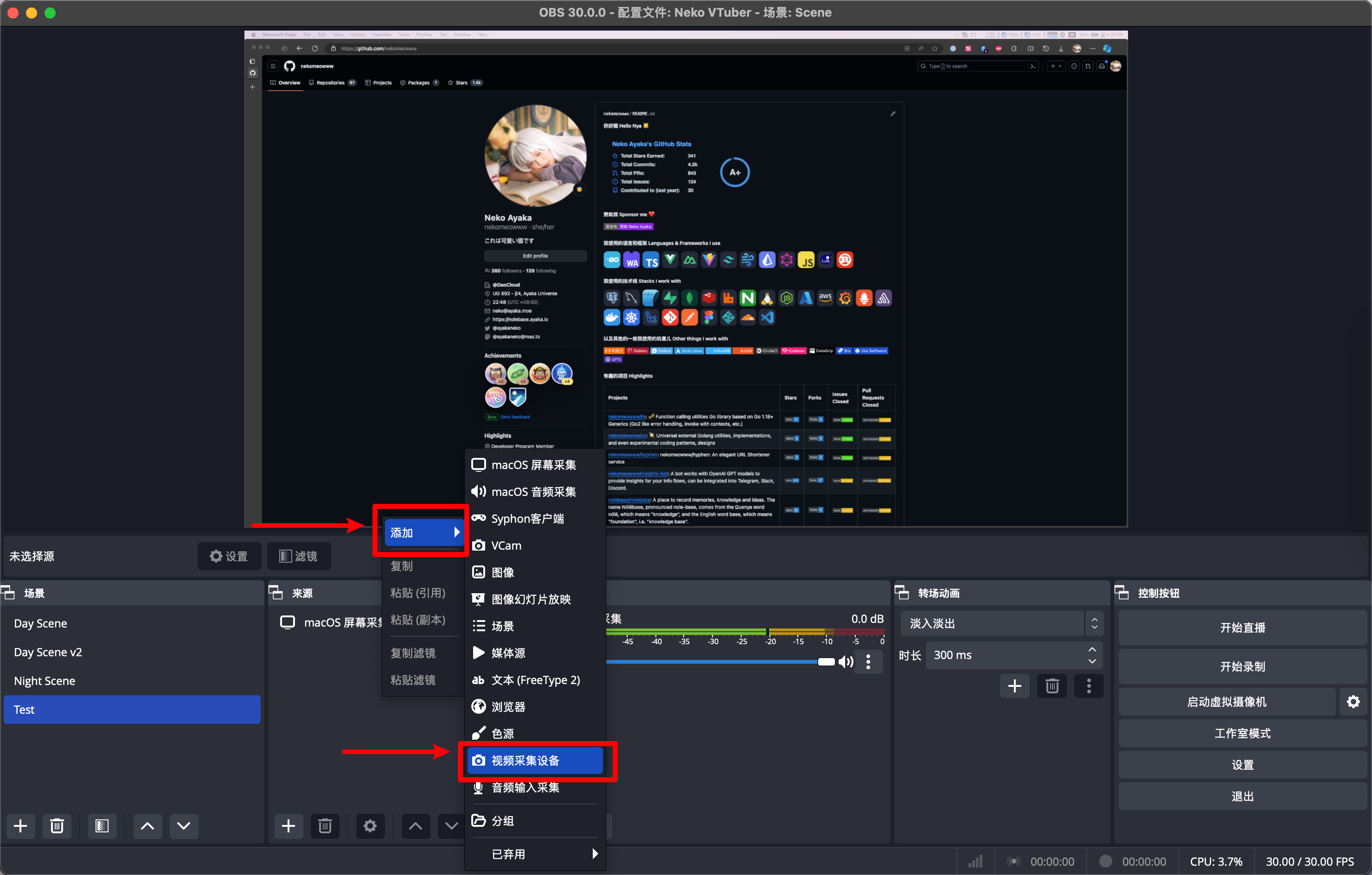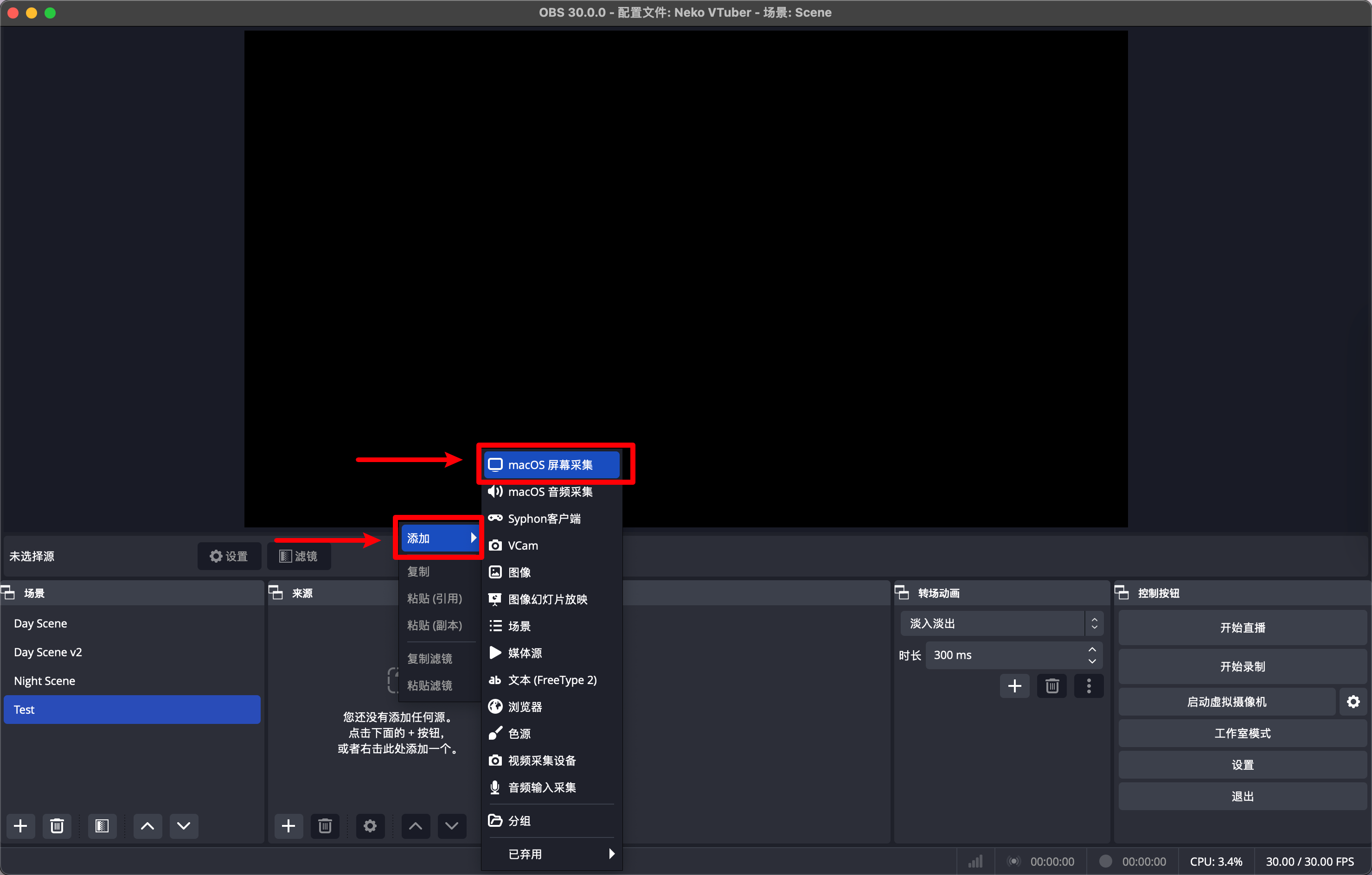 安装完成之后在来源分栏中点击右键,然后点选「添加」,再点选「macOS 屏幕采集」就可以添加显示屏采集了: