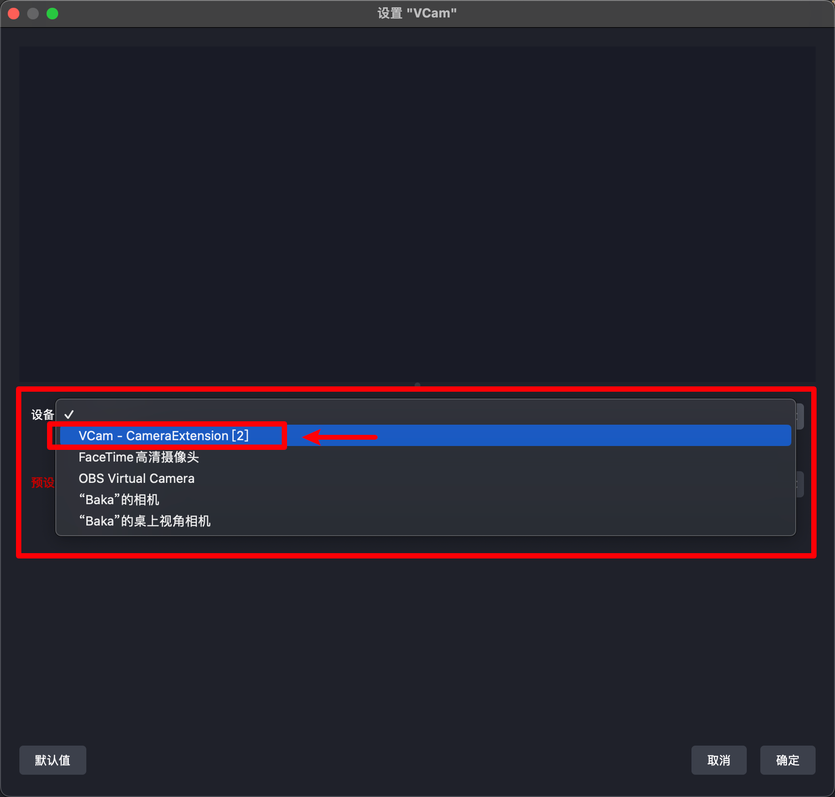 在第二个弹出的窗口中,我们需要选择希望添加的视频采集设备,正如之前所说,我们需要添加 VCam 为我们创建的虚拟视频设备,这个时候点选「设备」,然后在下拉菜单中选择「VCam」字样的设备作为我们的「虚拟摄像头」添加到 OBS 中: