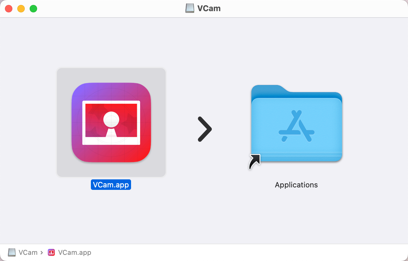 接下来我们安装,在安装的时候,按住触控板或者鼠标左键,将 VCam.app 的图标连根拔起,拖拽到右侧的 Applications 目录的顶部,然后放手即可。