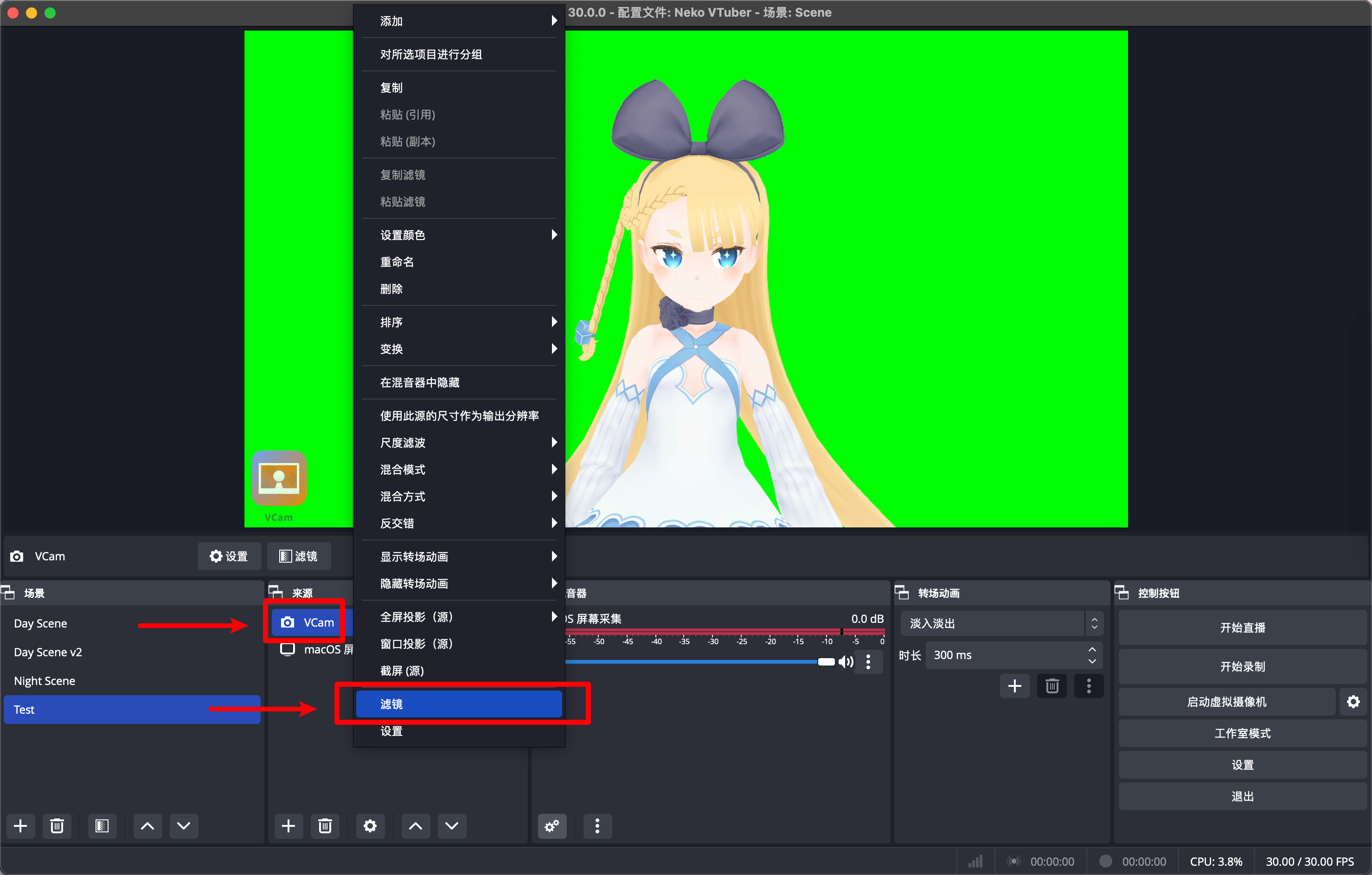 和之前一样,在已经添加的「VCam」(或者说 VCam 的虚拟摄像头)设备上右击,然后点选「滤镜」选项来配置滤镜。