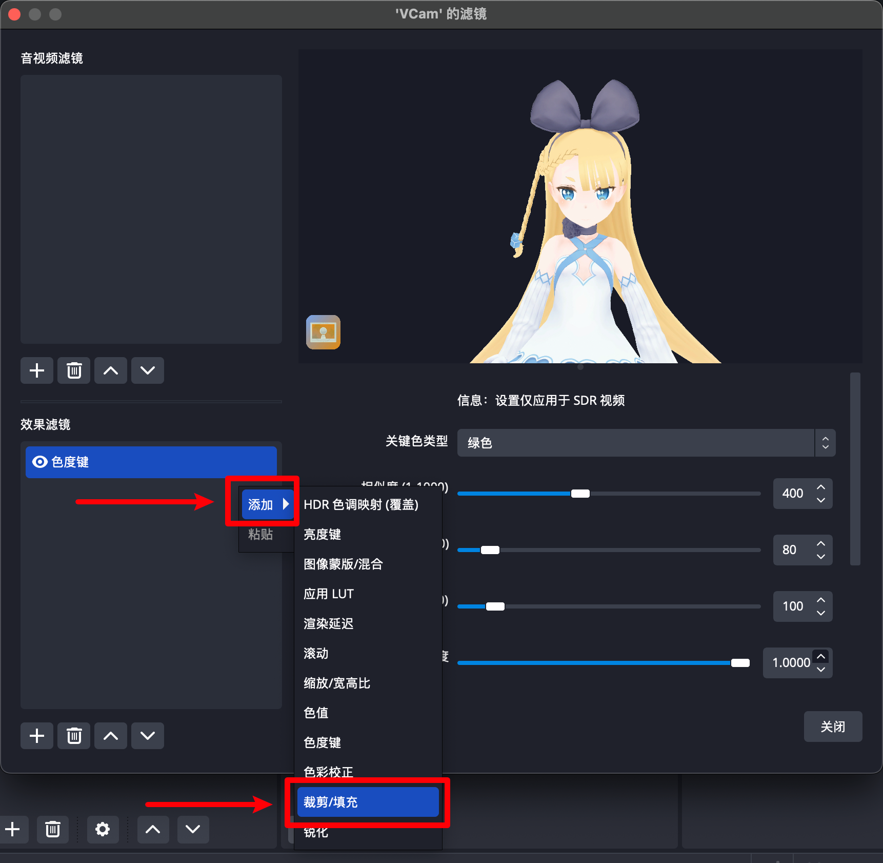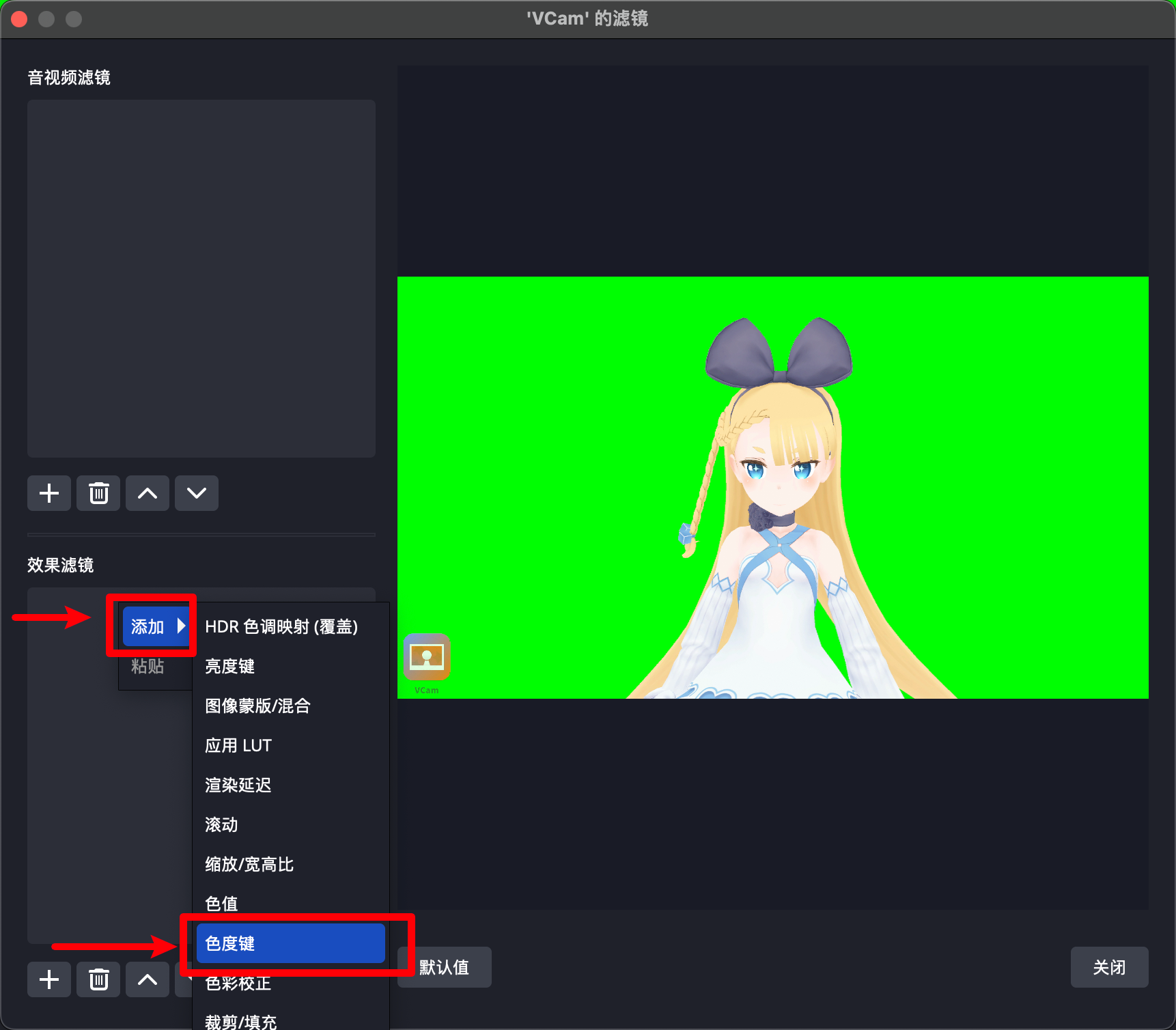 在「效果滤镜」这个分栏里面点击右键后点选「添加」,或者点击左下角「+」,然后点选「色度键」来添加一个「色度键」滤镜: