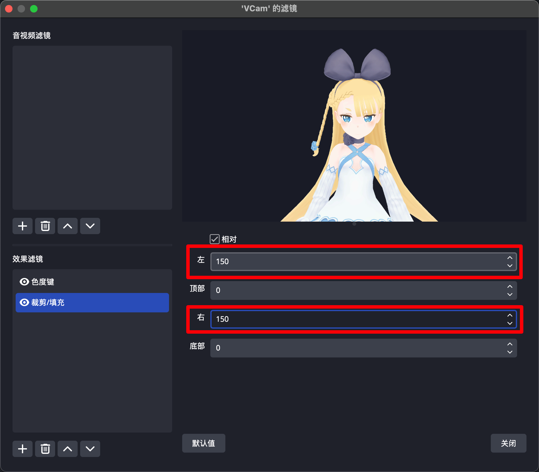 确认无误之后点击右下角关闭,就可以保存效果了然后返回 OBS 主窗口了。