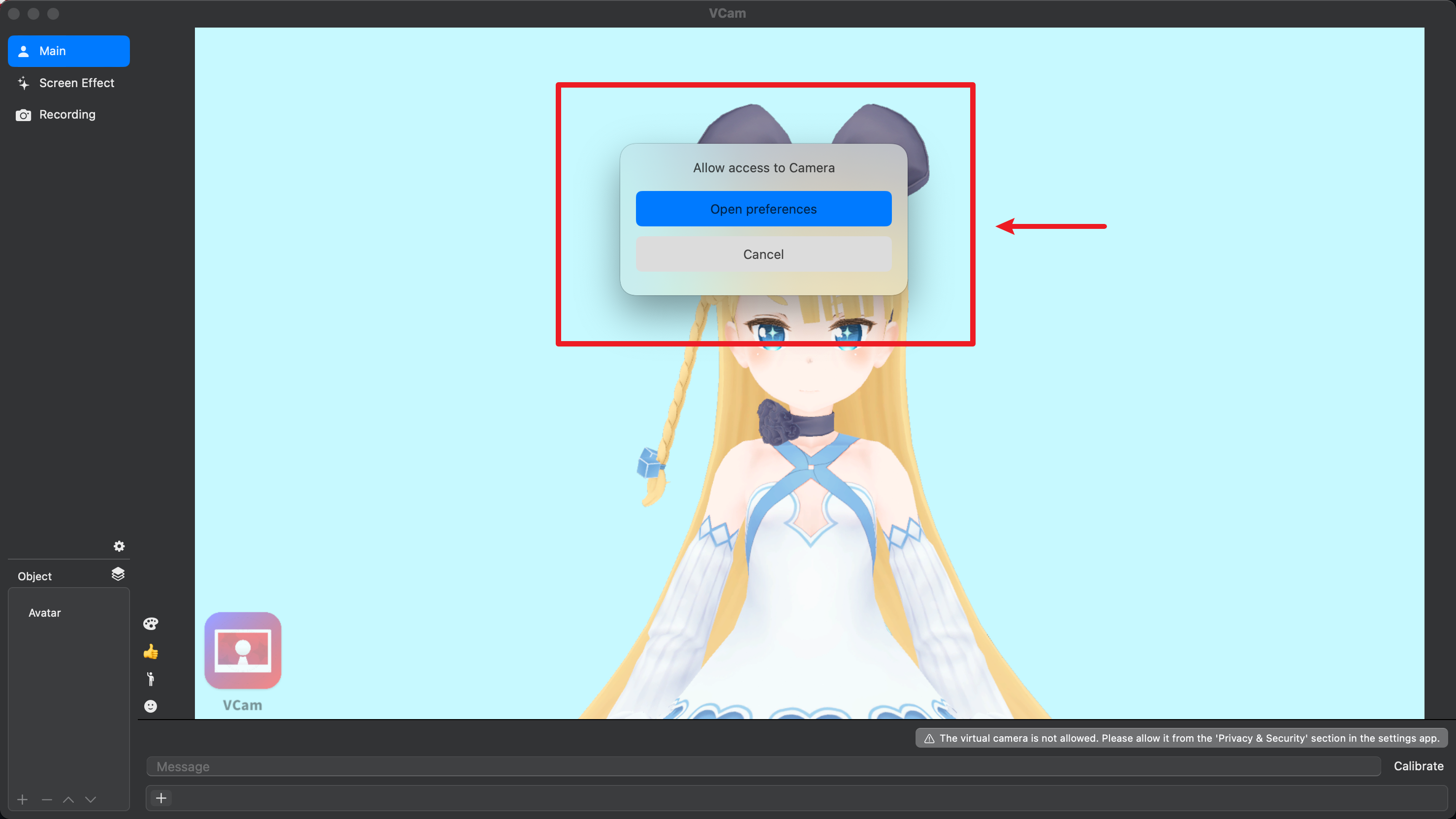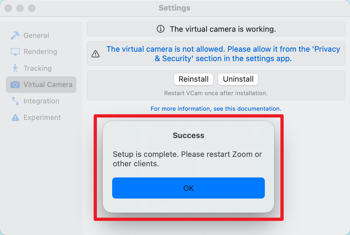 如果在之后的步骤中执行完成之后还是发现无法获得相关的权限,可以考虑完全重启一下 VCam 应用程序本身。