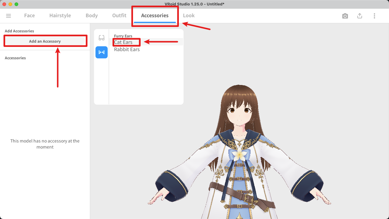 在顶部 Tab 栏中找到 Accessories(配件)这个 Tab,然后在左侧的选单中找到「Add Accessory(添加配件)」,然后在弹出的选单中找到「Cat Ears(猫耳朵)」,然后点击「Add(添加)」就可以添加猫耳朵了: