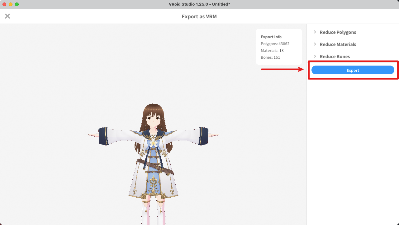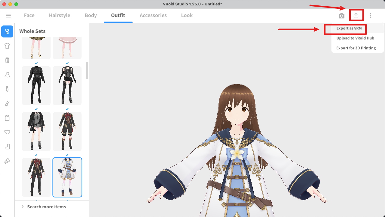 在导出的时候,在右上角找到「」图标,然后选择「Export as VRM(导出为 VRM)」的选项来开始导出的向导: