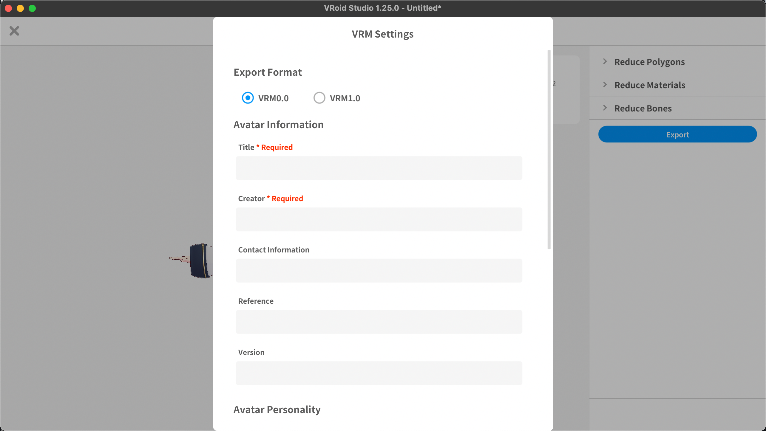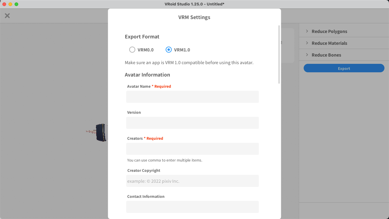 在这个文档中我们就直接选择 VRM0.0 就好了。填写一下必须要填写的 Title 和 Creator 字段就行,然后滚到最下方点选 Export 就可以导出模型了: