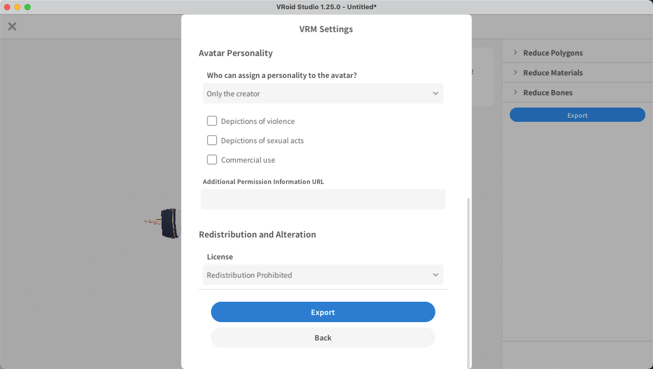 VRM 格式中除去必要的模型的多边形、骨骼、材质贴图和贴图、坐标的绑定之外,还有对于模型和 VRChat 模型生态最为重要的对于创作者的保护。这样的保护是通过在 VRM 模型数据中写入模型的创作者、创作者的联系方式,以及不同版权控制策略下的条款制约限制来实现的,当用户加载和尝试修改 VRM 的时候加载器和动画绑定器将会读取这些数值然后判断用户是否拥有许可,从而实现对创作者和创作资源的保护。