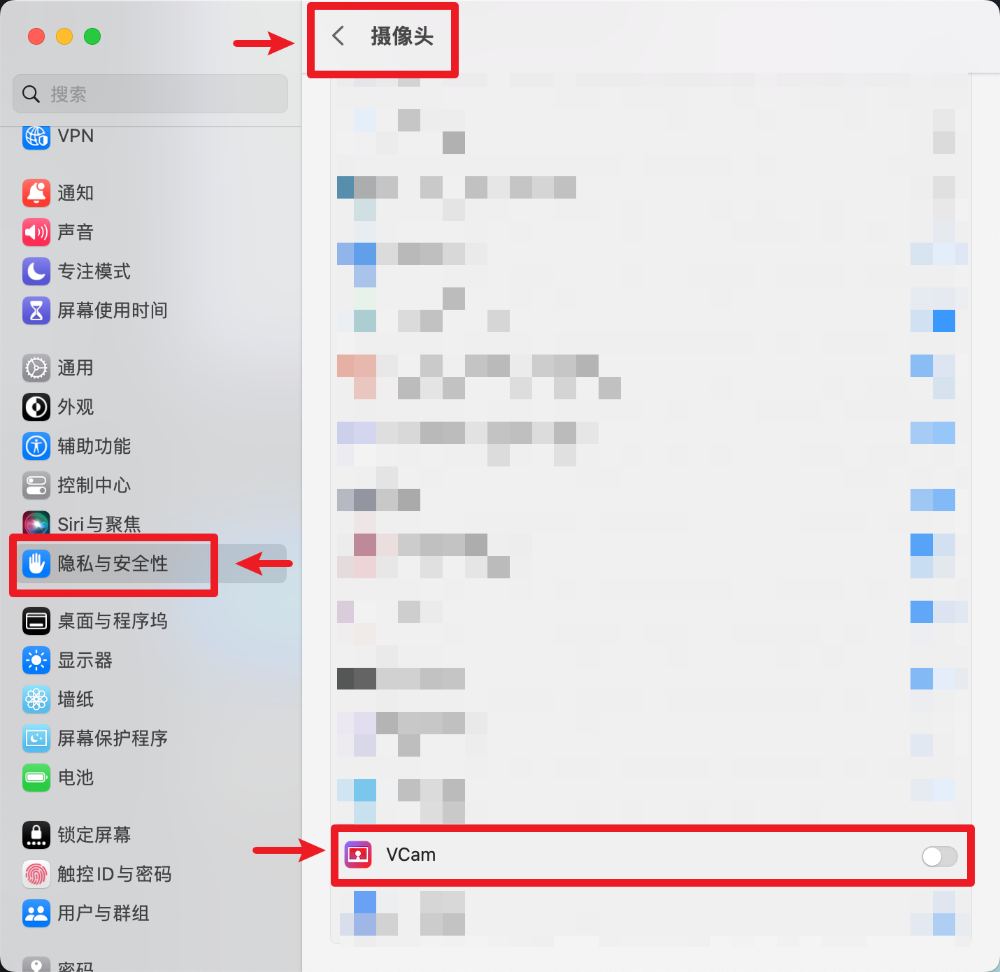 要给它授权摄像头权限的话,它应该会自动打开到摄像头相关的权限界面,这个时候我们需要二次确认是否是「隐私与安全性」设置一栏的「摄像头」相关权限列表,在这个列表中可以找到 VCam 的图标和应用程序名称,点选右侧的按钮打开即可,这意味着我们授权 VCam 使用和访问我们摄像头的信息。