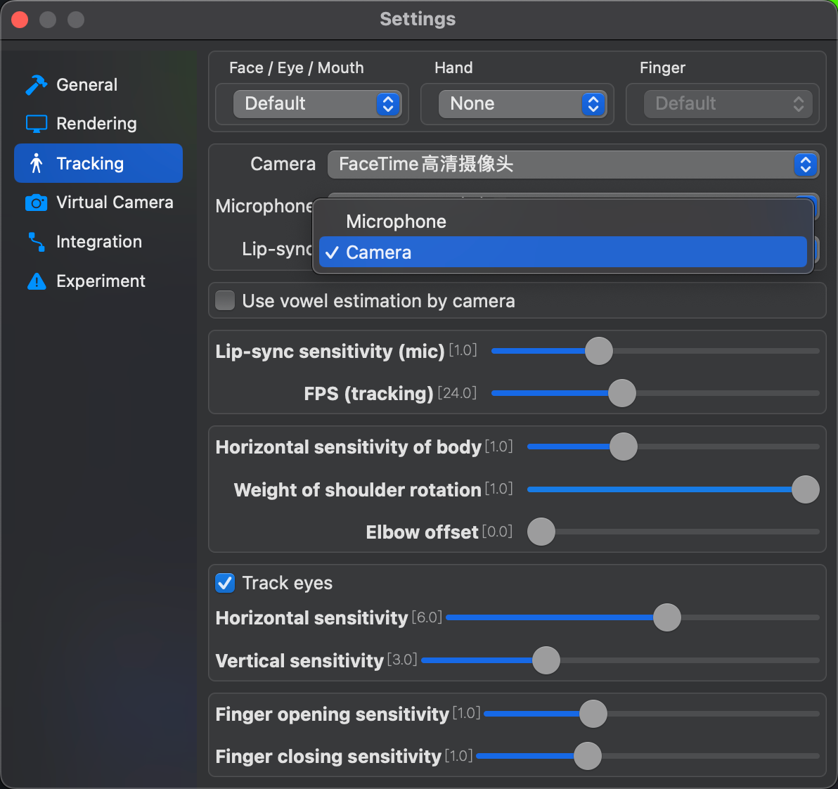 2. 默认的情况下,VCam 将会使用麦克风的音频振幅大小来判断是否让模型人物的嘴巴张开,如果环境不够安静的话,很容易造成自己的人物模型一直处于一个张嘴的形态。我会选择在「Tracking(追踪)」侧边栏选单的「Lip-sync(嘴唇同步)」配置选项选择「Camera(摄像头)」,而非默认的「Microphone(麦克风)」