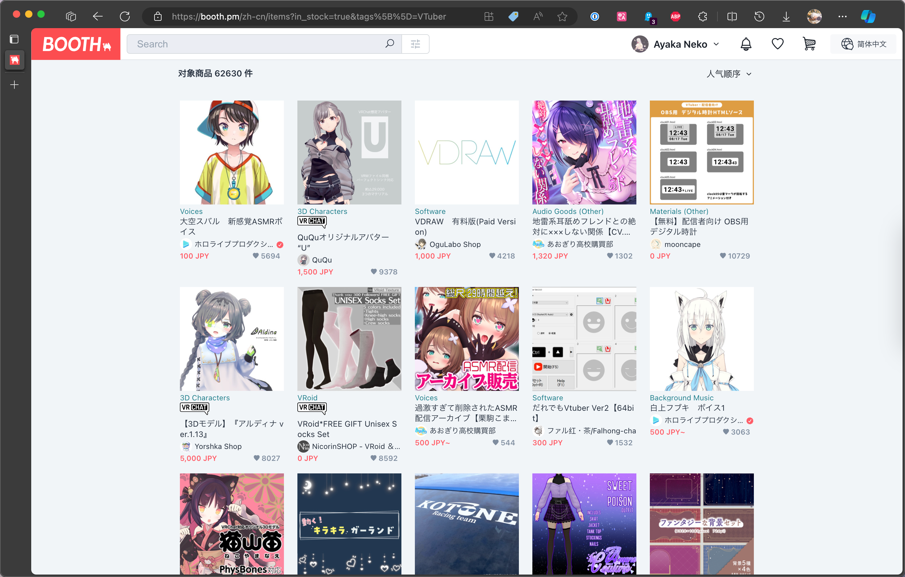 Booth 里可见的从 VRChat 可以用的袜子、人物模型、Vtuber 直播软件,到直播用的背景和人设商品