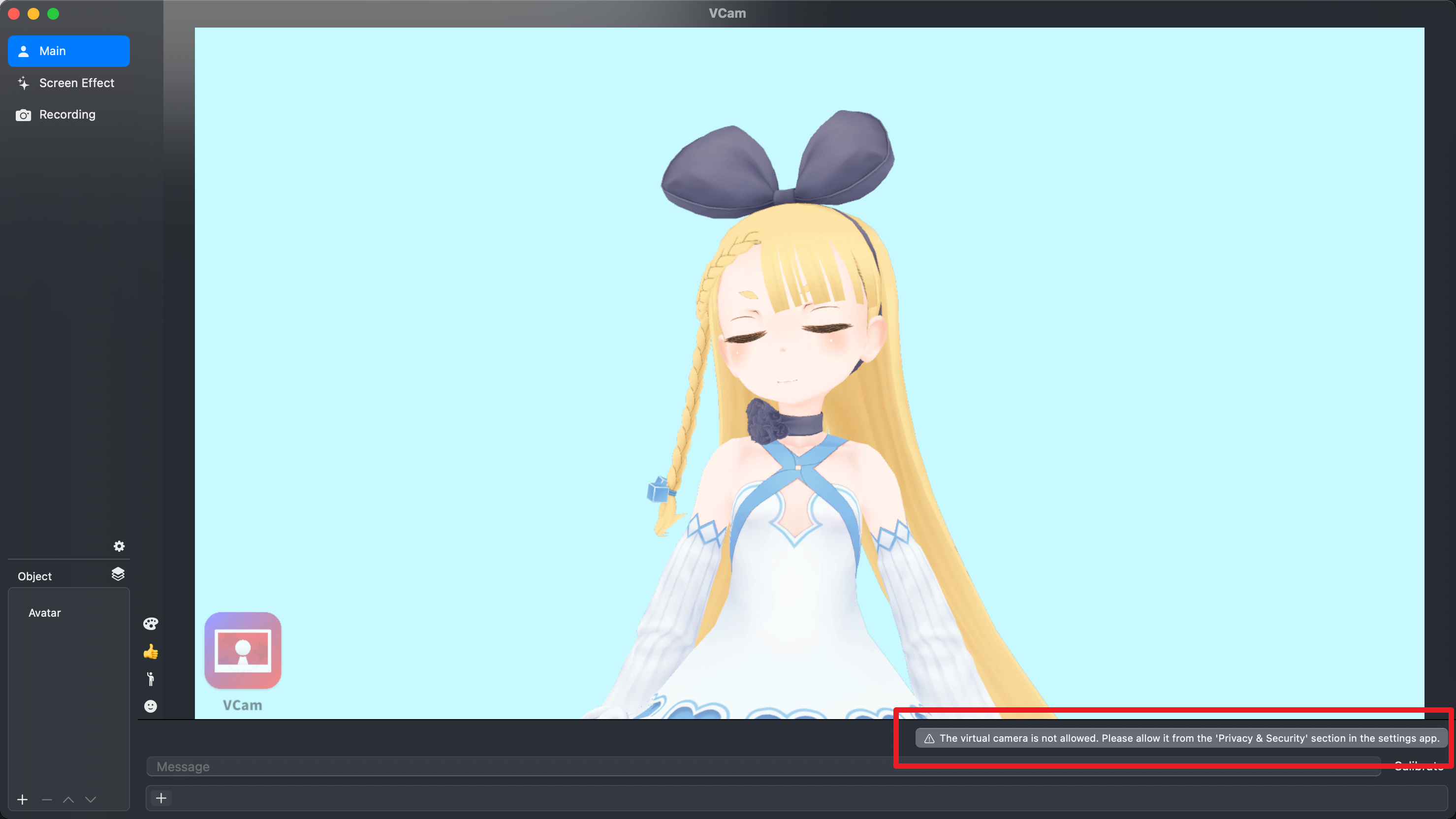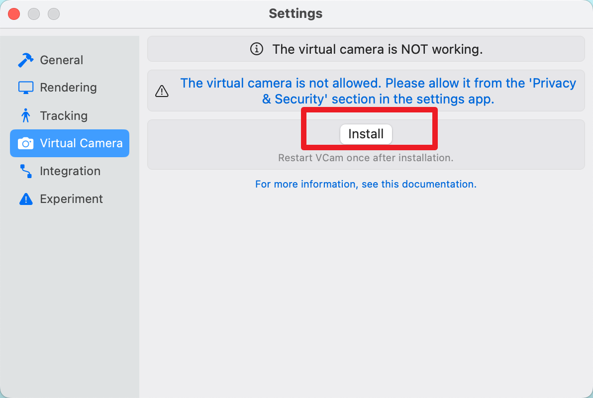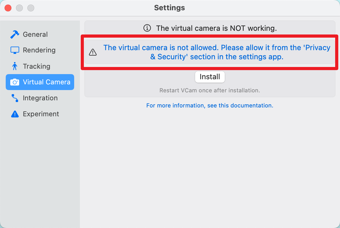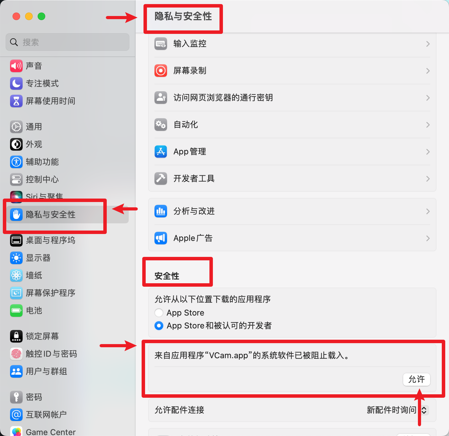 进入到这个页面之后就可以看到指引和提示,让我们去「系统设置」应用程序中对「隐私和安全性」进行配置,允许 VCam 希望安装的虚拟摄像机的拓展的安装请求: