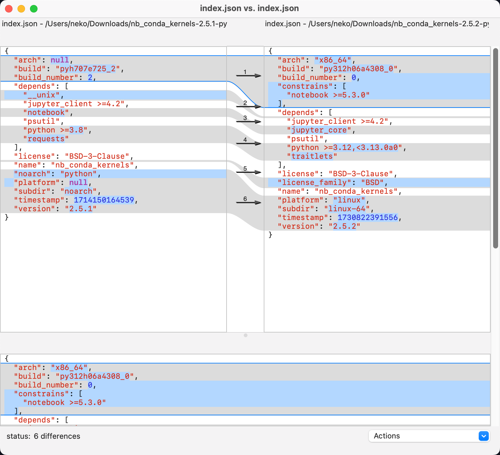 opendiff nb_conda_kernels-2.5.1-pyh707e725_2/info/info/index.json nb_conda_kernels-2.5.2-py312h06a4308_0/info/info/index.json直接进行 diff 对比: