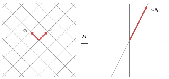 这里的 是拉伸尺度(scalar)。从几何上看,M 对向量 进行了拉伸,映射变换。 称作矩阵 M 的特征向量(eigenvector), 称作为矩阵M 特征值(eigenvalue)。这里有一个非常重要的定理,对称矩阵M 的特征向量是相互正交的。