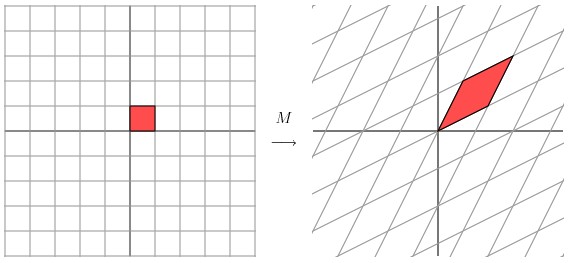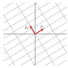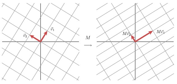 如果我们用这些特征向量对网格平面进行线性变换的话,再通过 M 矩阵对网格平面进行线性换的效果跟对M 矩阵的特征向量进行线性变换的效果是一样的。 对于更为普通的矩阵而言,我们该怎么做才能让一个原来就是相互垂直的网格平面(orthogonal grid), 线性变换成另外一个网格平面同样垂直呢?PS:这里的垂直如图所示,就是两根交错的线条是垂直的。