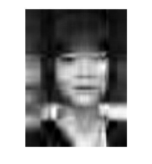 隐约可以辨别这是短发伽椰子的脸……但还是很模糊,毕竟我们只取了5个奇异值而已。下面我们取20个奇异值试试,也就是(1)式等式右边取前20项构成