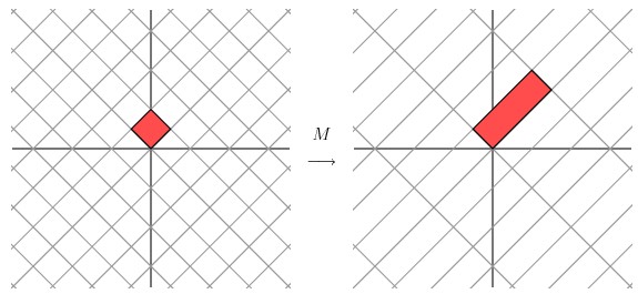 这种变换效果看起来非常的奇怪,在实际环境下很难描述出来变换的规律 ( 这里应该是指无法清晰辨识出旋转的角度,拉伸的倍数之类的信息)。还是基于上面的对称矩阵,假设我们把左边的平面旋转45度角,然后再进行矩阵M 的线性变换,效果如下图所示: